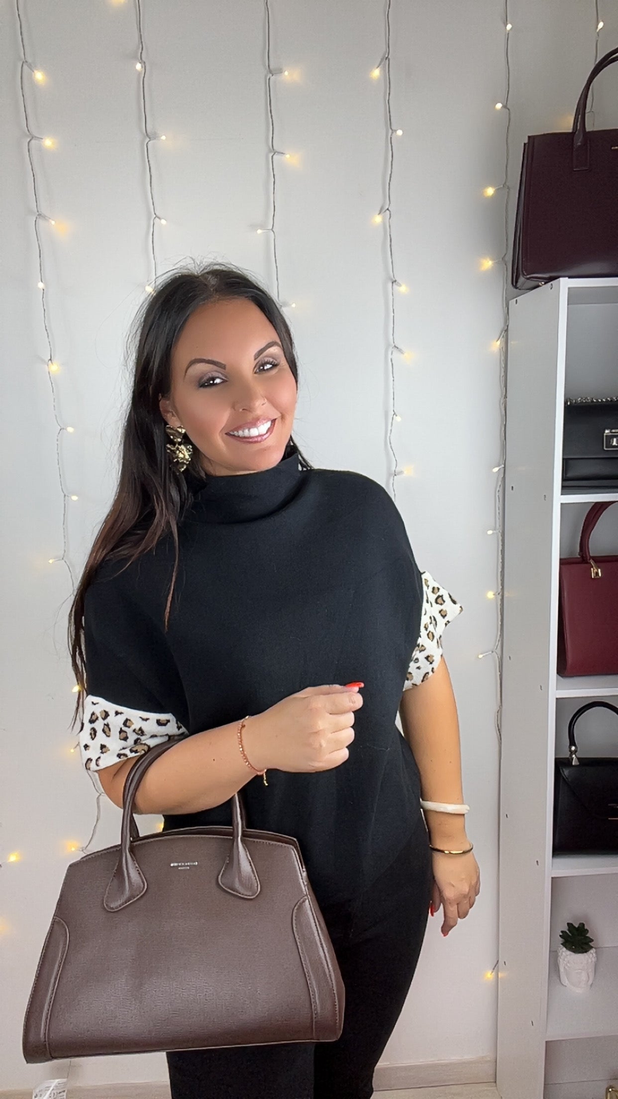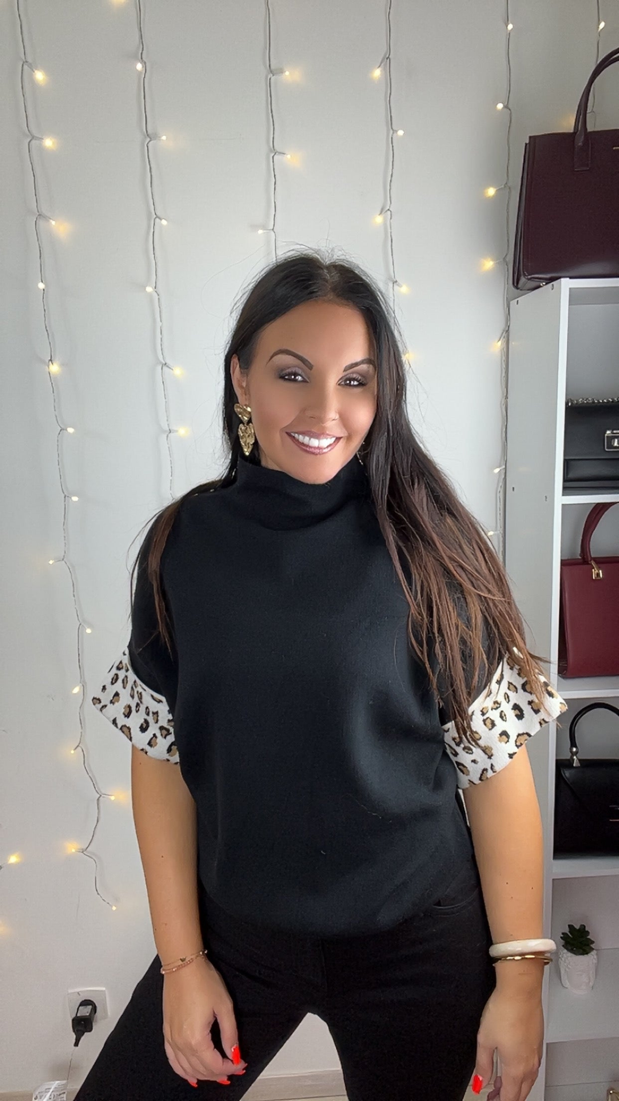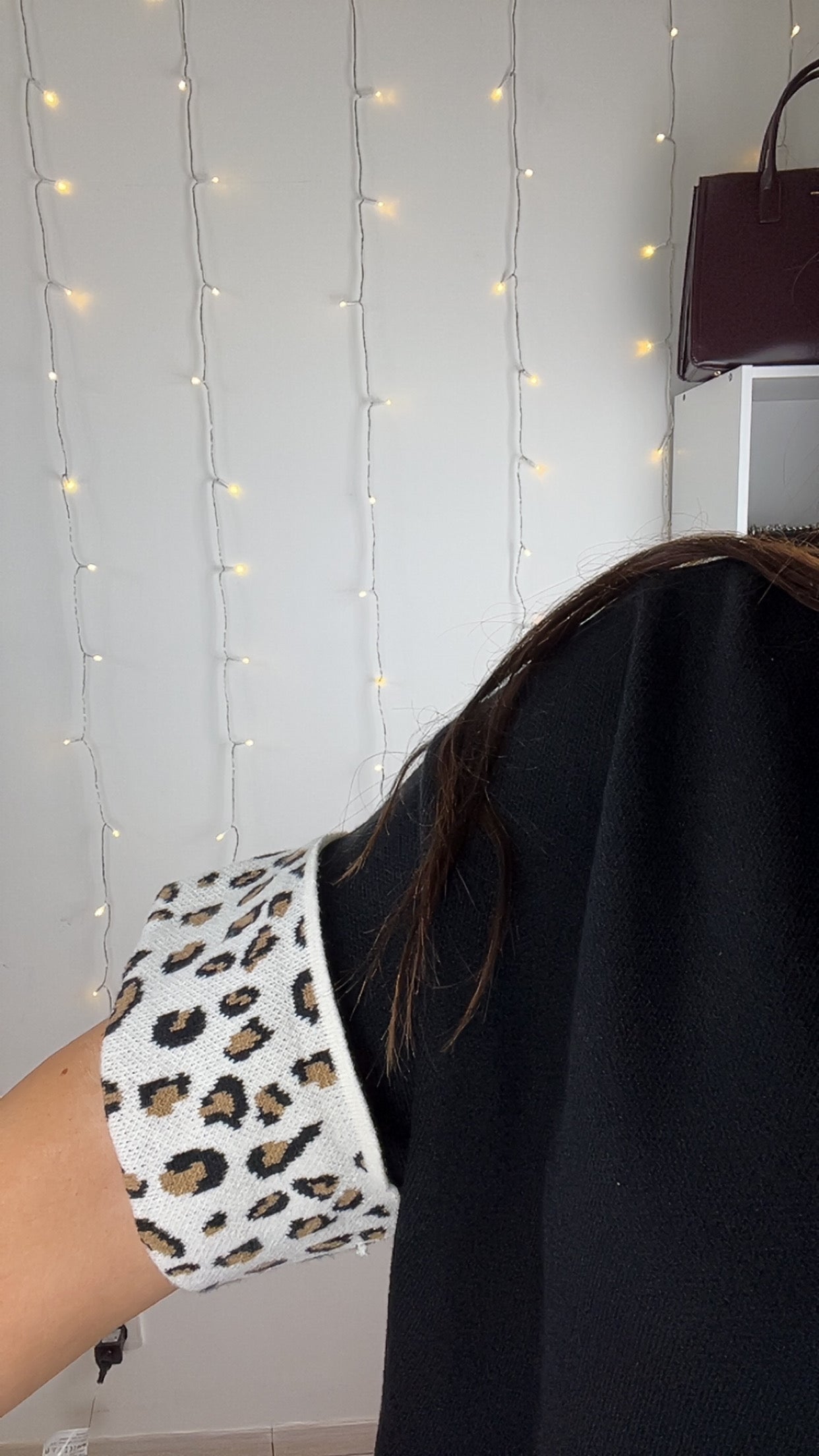 La surprise se cache dans les détails : des revers en imprimé léopard au niveau des coudes, contrastant subtilement avec le noir profond du pull. Un jeu de matières et de motifs qui rend cette pièce à la fois intemporelle et audacieuse, idéale pour l’automne.